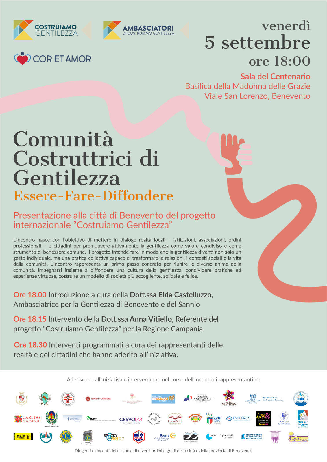 L'evento dal titolo " Comunità Costruttrici di gentilezza: Essere – Fare - Diffondere", patrocinato da questo Ordine Professionale, si terrà il giorno 5 settembre 2025 presso la Sala del Centenario della Basilica della Madonna delle Grazie, sita in Viale San Lorenzo a Benevento.